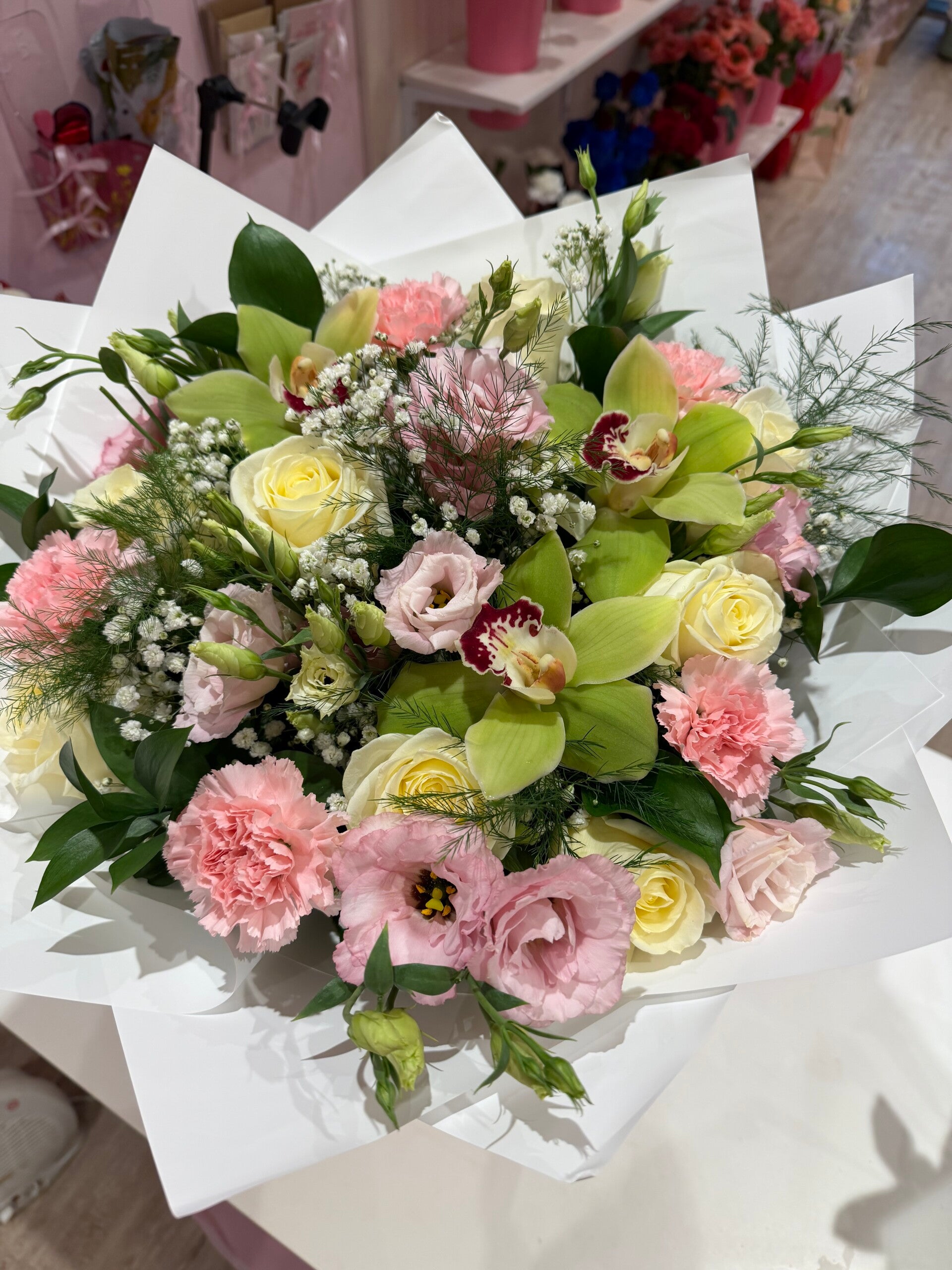 Large bouquet with white roses, orchids, lisianthus and grenarries.Wrapped in white paper and aqua pack.Includes a message card and flower food.