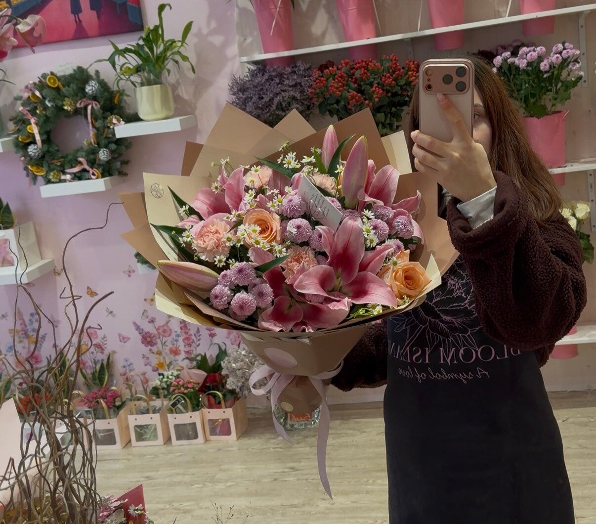 A large arrangement of lilies with chrisantems and roses. Includes a box, message card and wrapped with aqua pack.