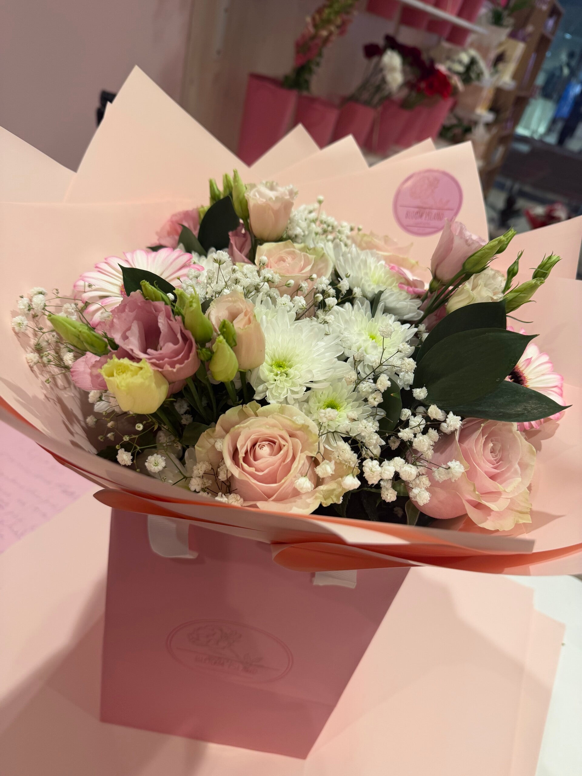 an arrangement in box with pastel pink Lisianthus, gerbera and roses. White chrisantems to give a more pastel vibe for those who like a classical bouquet and minimalistic.