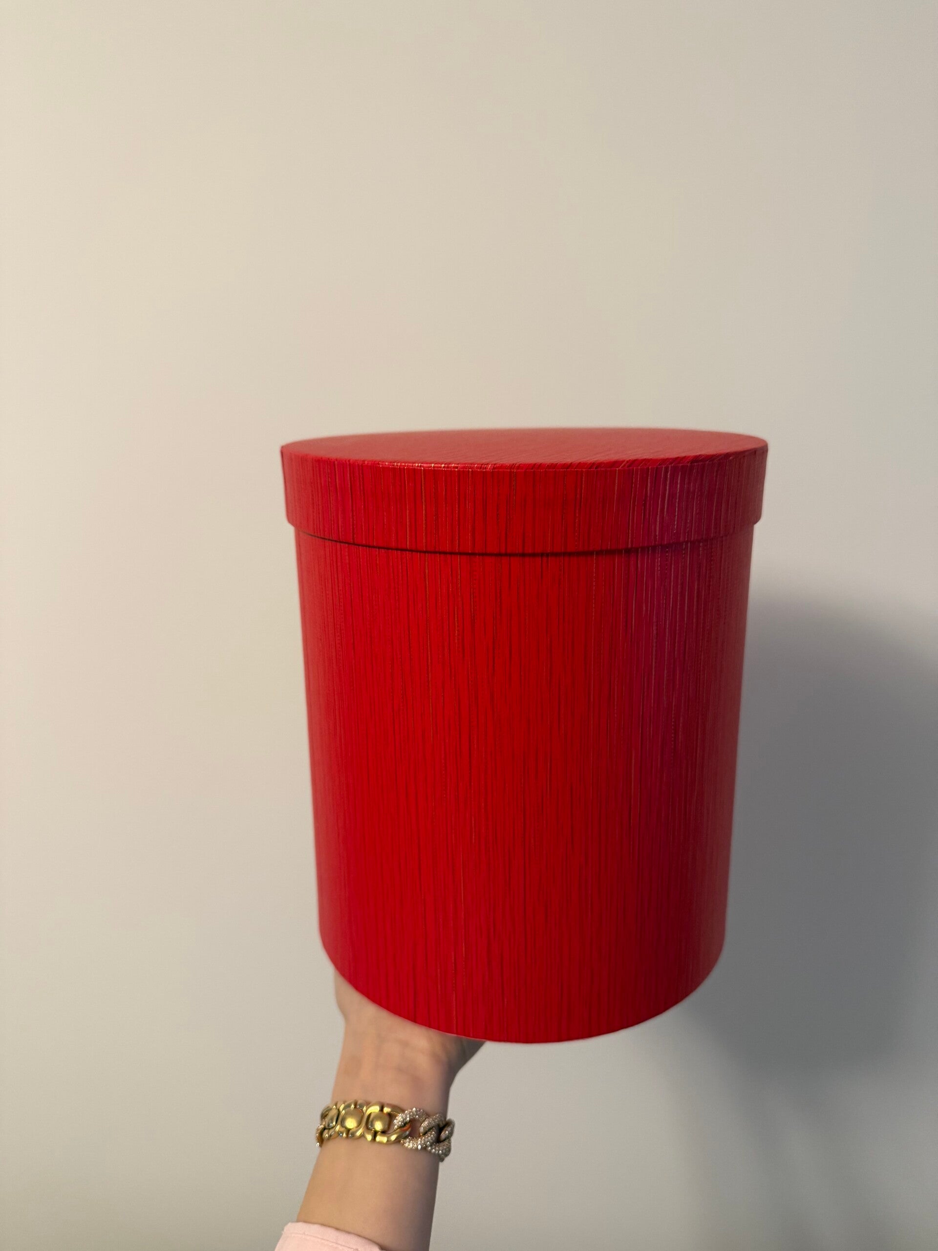 Tall red hat box for flower arrangements. Perfect with roses for long time lasting.