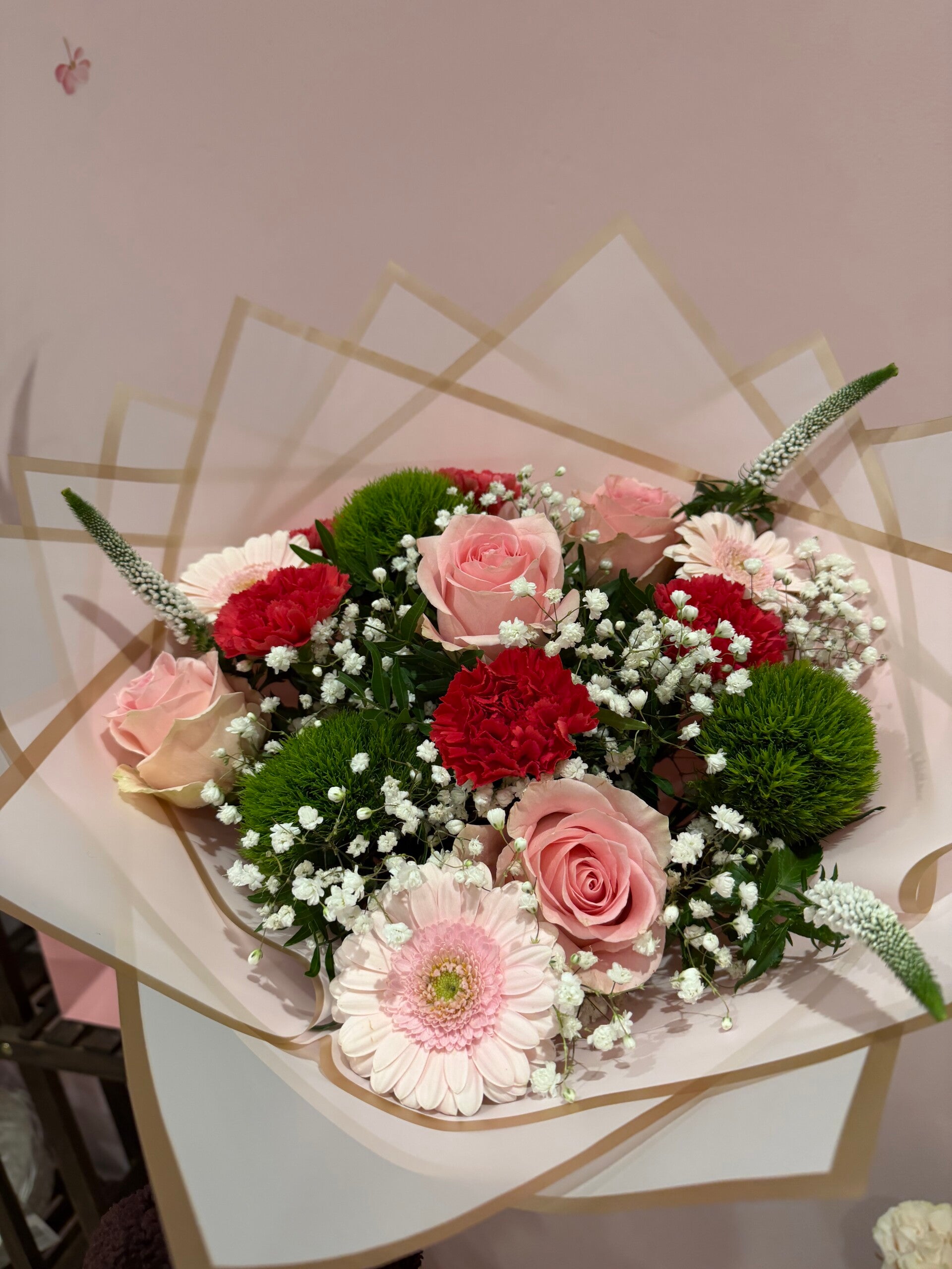 A soft and romantic arrangement blending delicate pink roses, pastel gerberas, rich red carnations, and fresh green accents, finished with airy white filler flowers. This bouquet is beautifully wrapped in layered neutral paper, creating a modern yet timeless look.