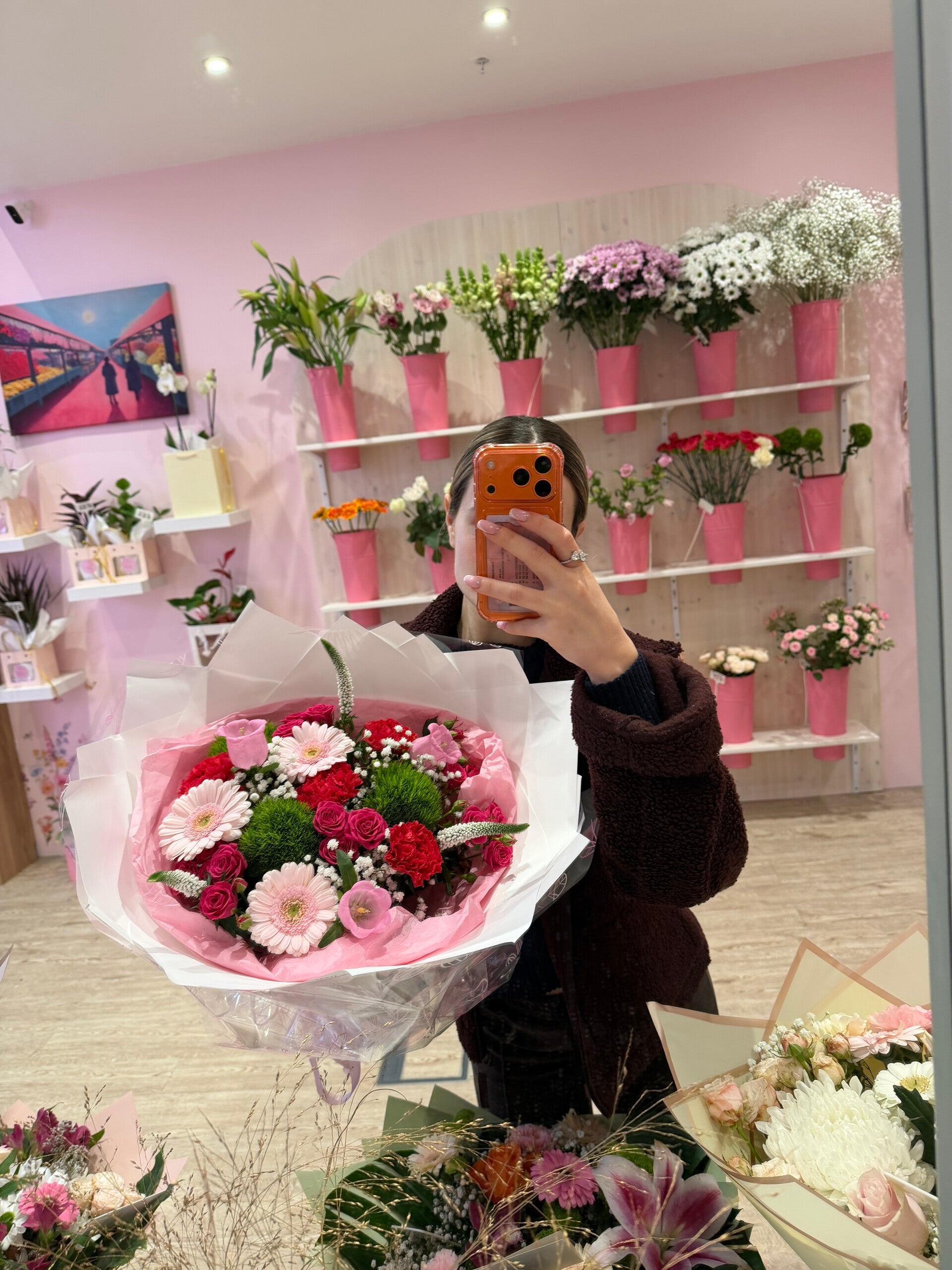 A romantic bouquet featuring pink roses, gerberas, red carnations, and fresh greenery, designed to charm and delight. A perfect bouquet for pink lovers. Comes with a stylish box and a message card.