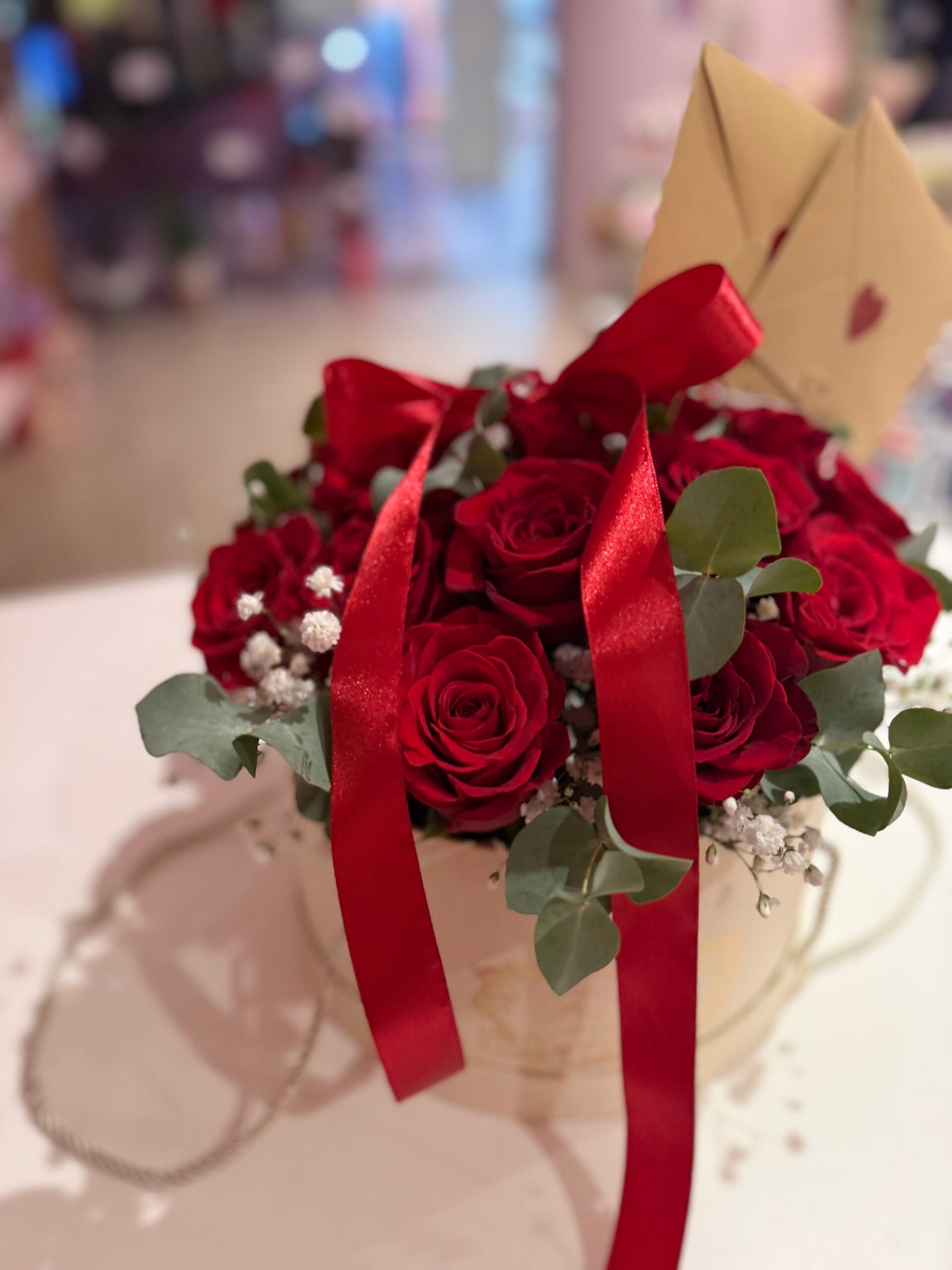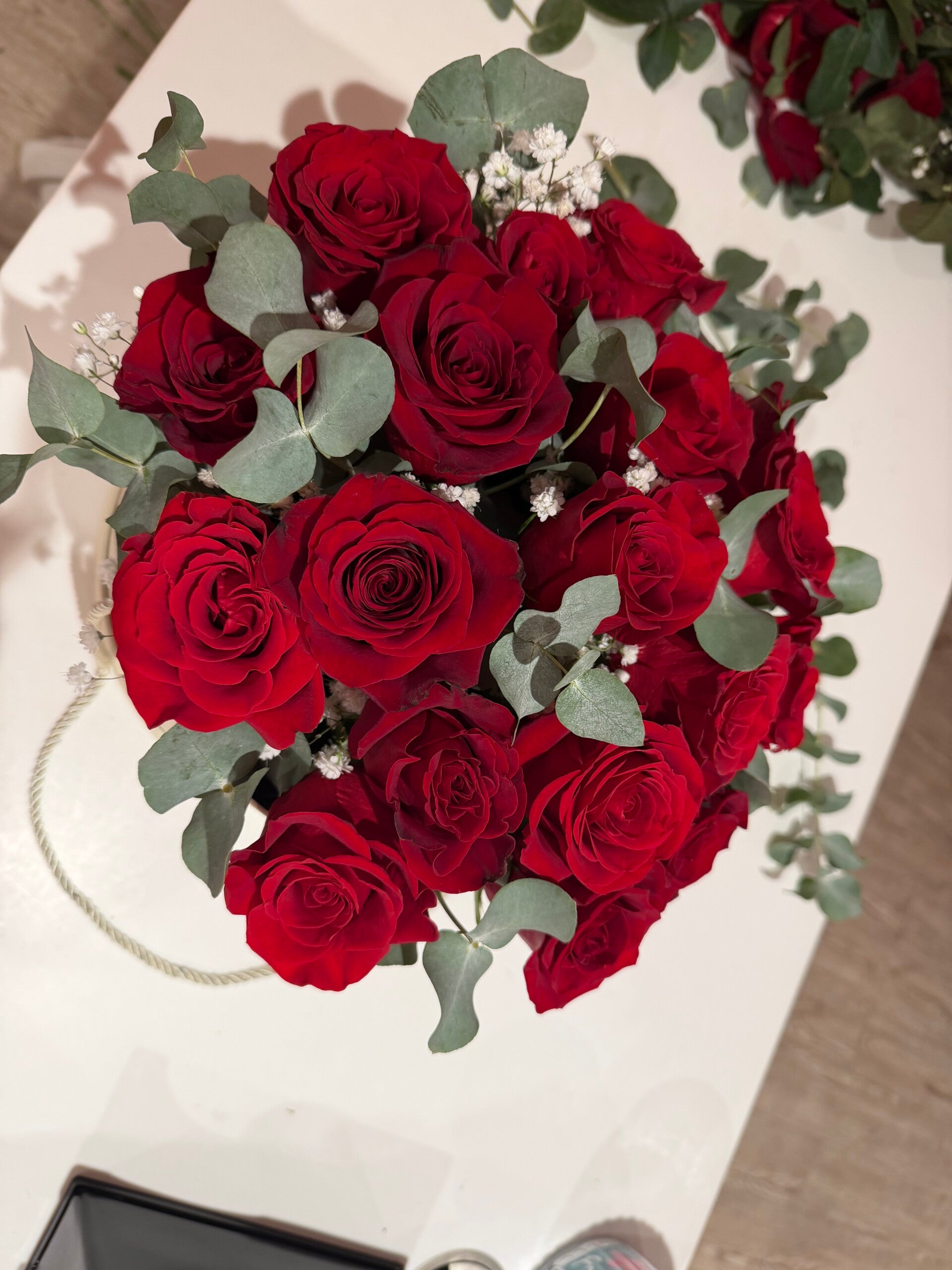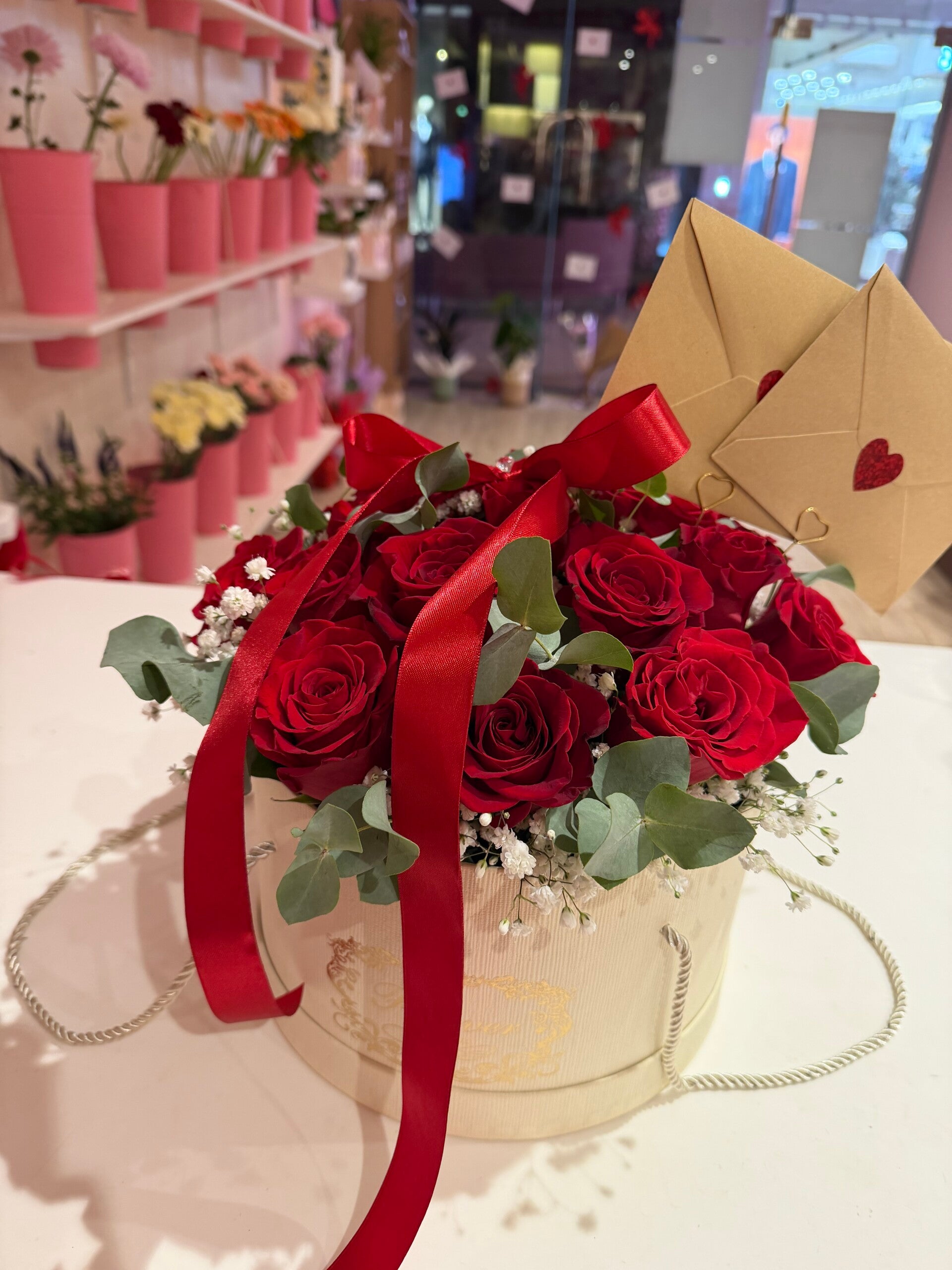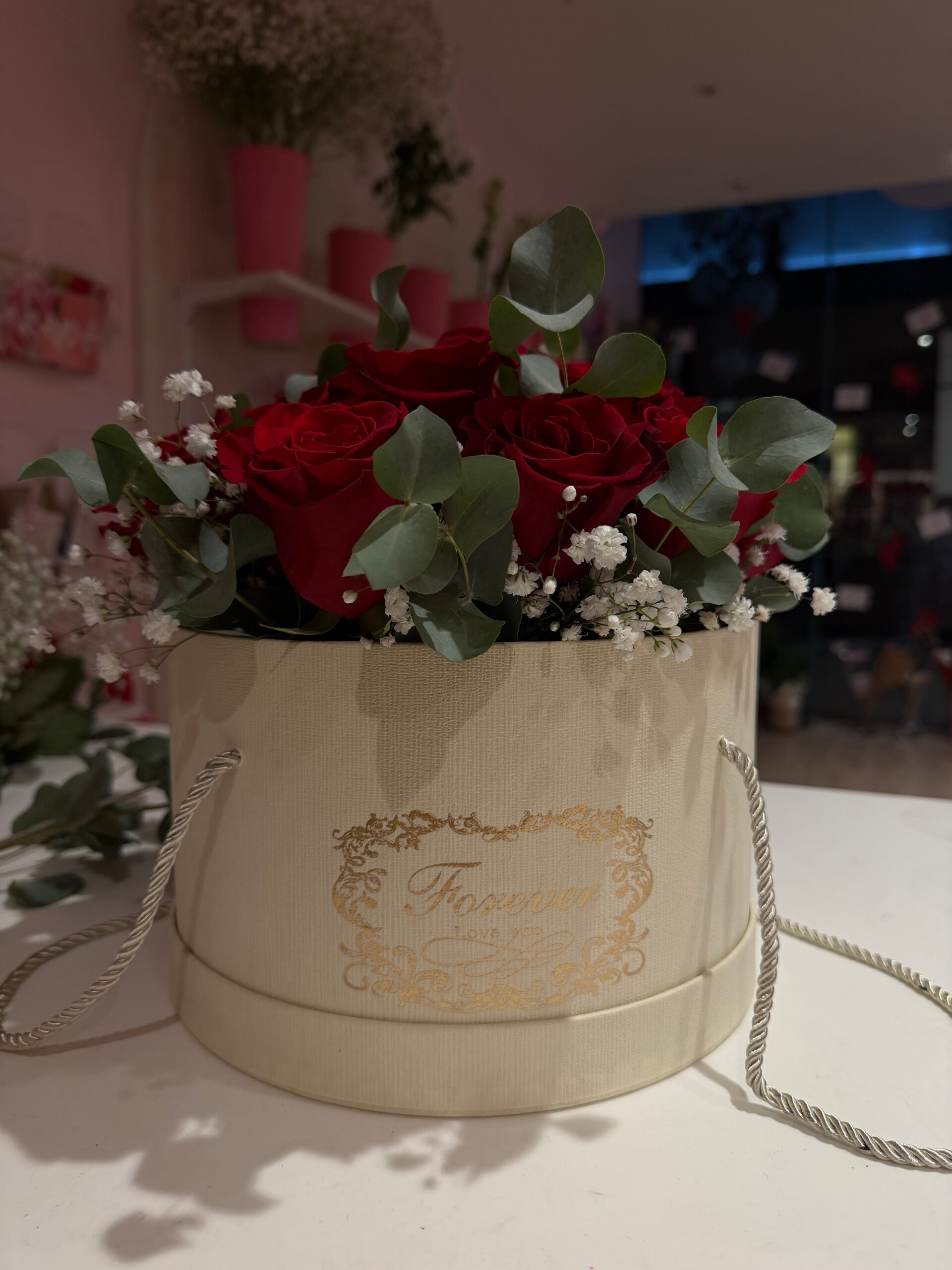 20 Red roses hat box for a special occasion, also perfect for (Valentine's Day). Comes with a message card.