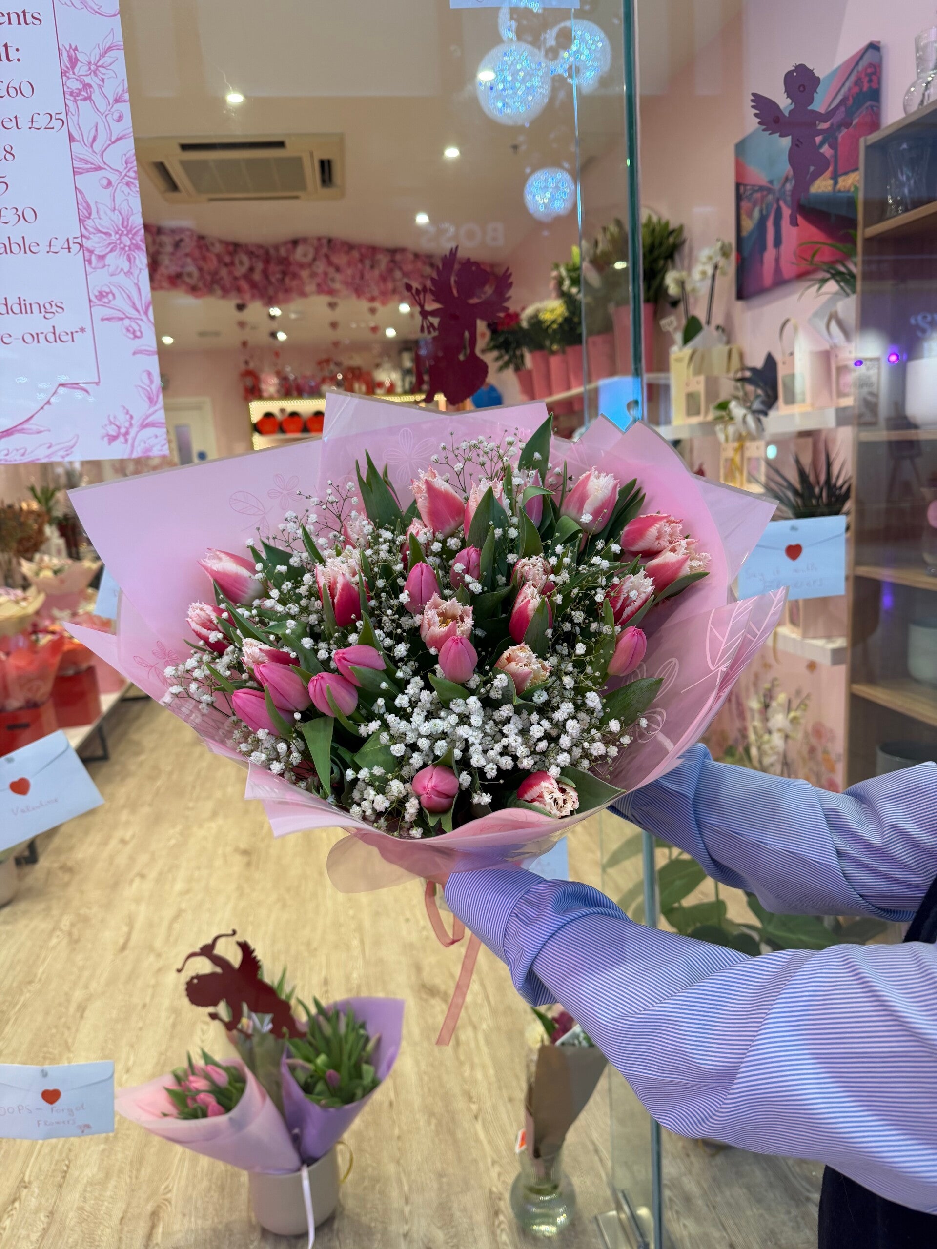 A fresh and playful bouquet featuring a mix of pink tulips in different varieties, including softly curled, ruffled petals. Paired with delicate gypsophila, this arrangement feels light, modern, and full of spring charm.