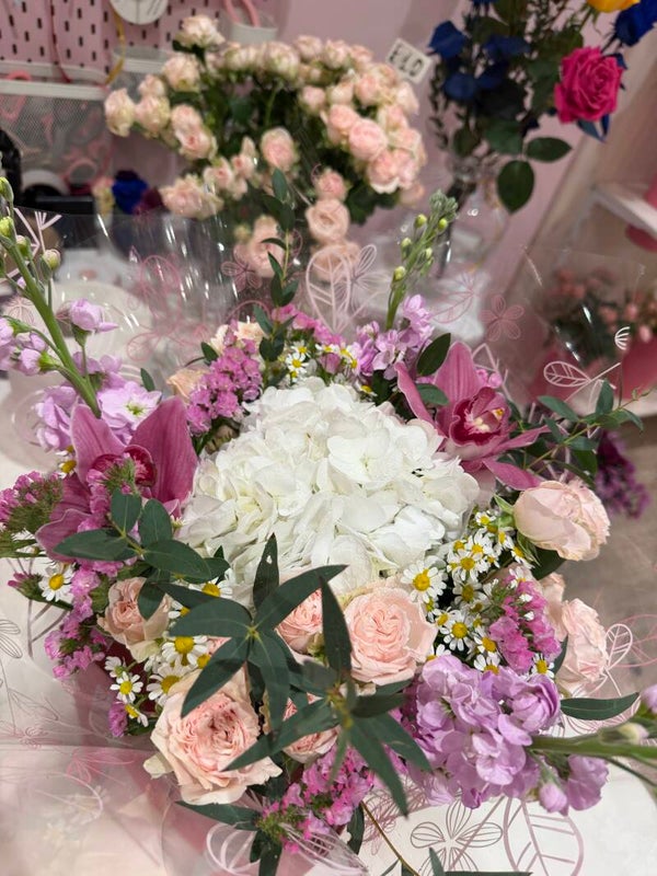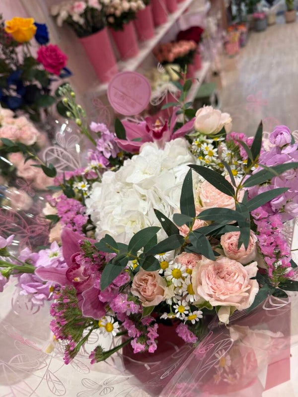 A delicate and elegant floral arrangement presented in a stylish pink gift box. This bouquet features a voluminous white Hydrangea at the center, surrounded by soft blush Garden Roses and creamy peach Ranunculus. Airy sprigs of Baby's Breath add a light, cloud-like texture, while vibrant pink Gerbera Daisy accents bring a cheerful touch of color.