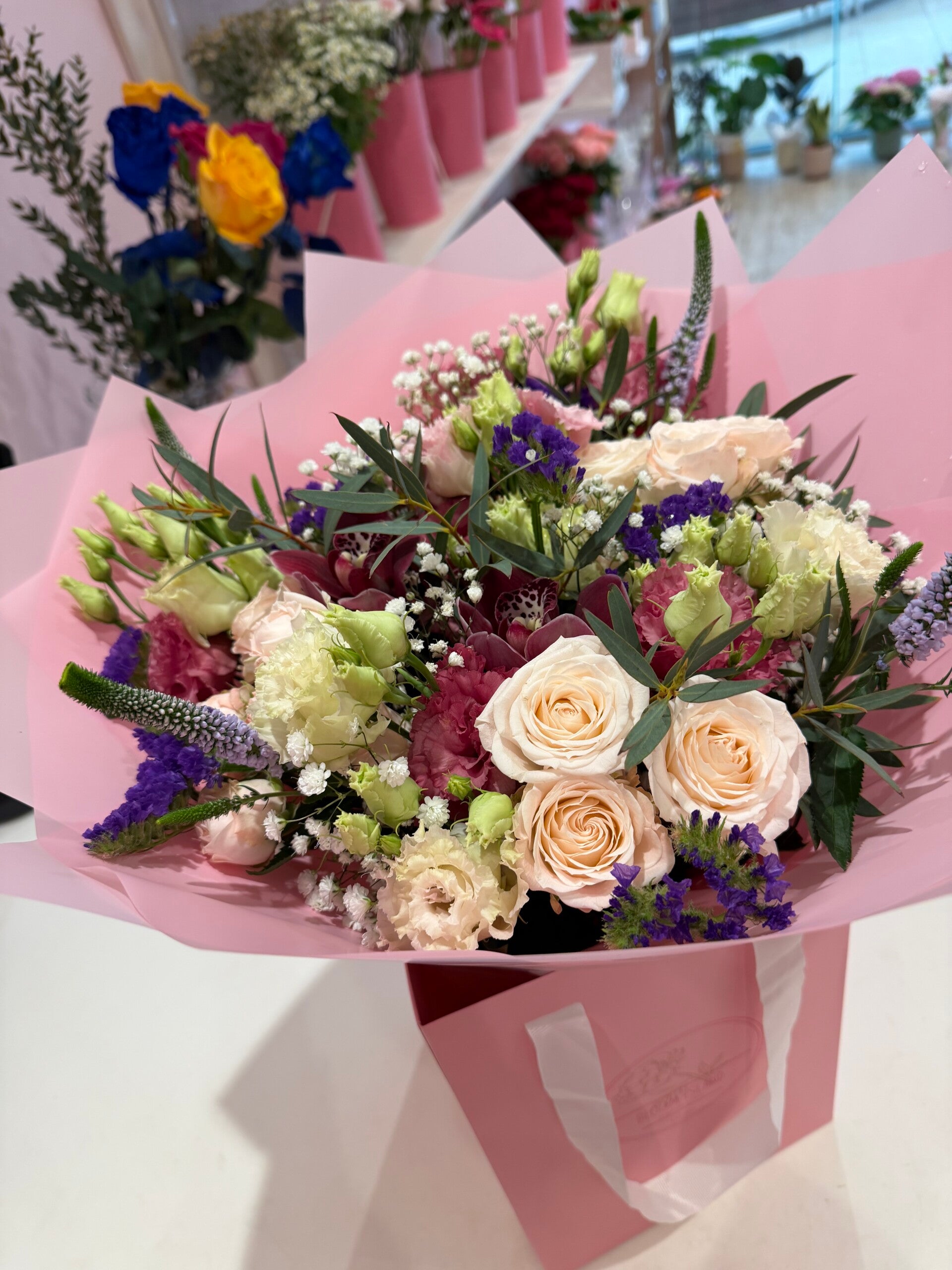 A vibrant and elegant floral arrangement presented in a soft pink gift box. This bouquet features delicate blush-toned Garden Roses as the focal point, beautifully complemented by airy clusters of Baby's Breath and textured accents of purple Statice. Graceful stems of Lisianthus add softness and volume, while exotic touches of Cymbidium Orchid bring depth and sophistication to the arrangement.