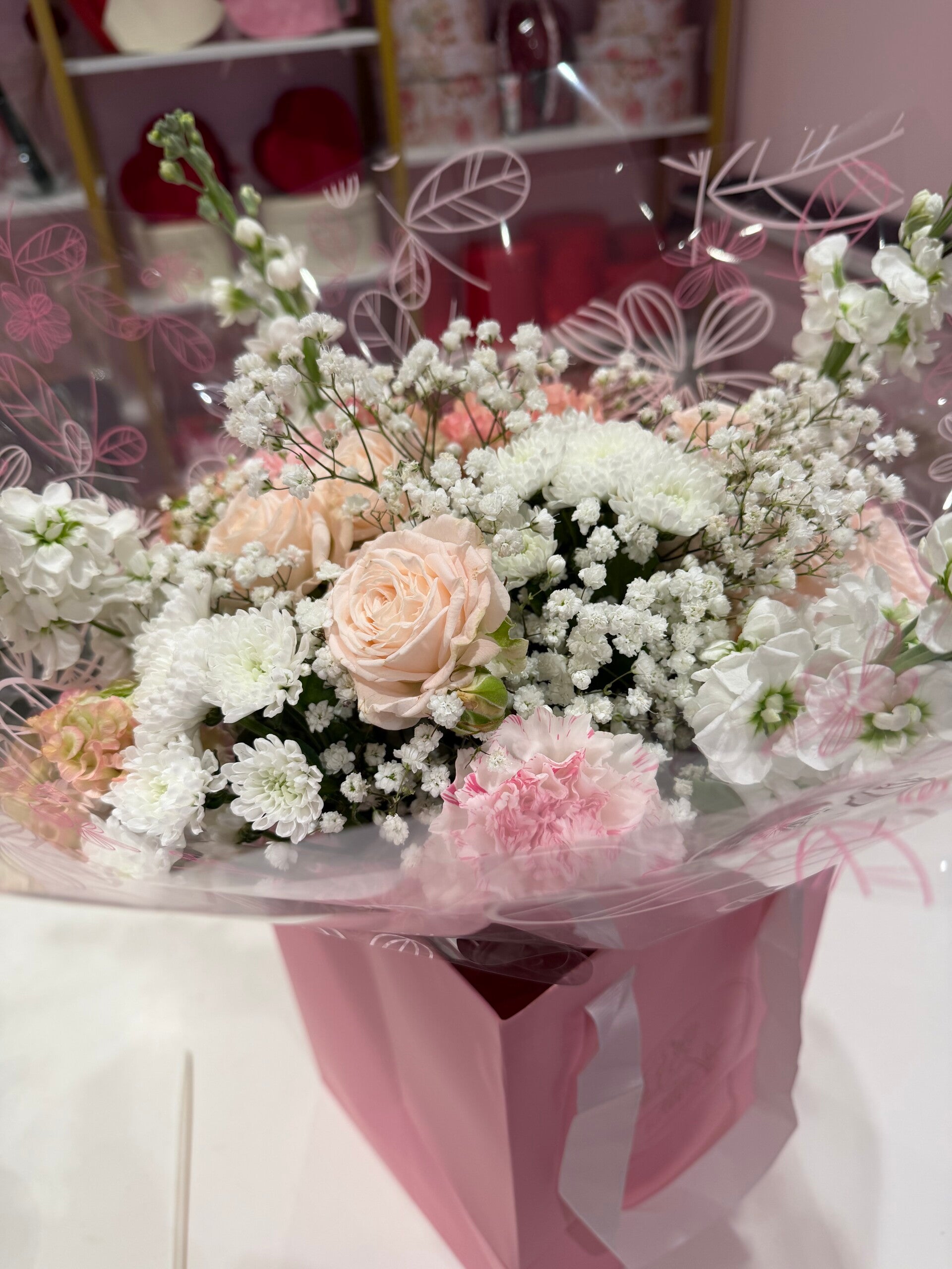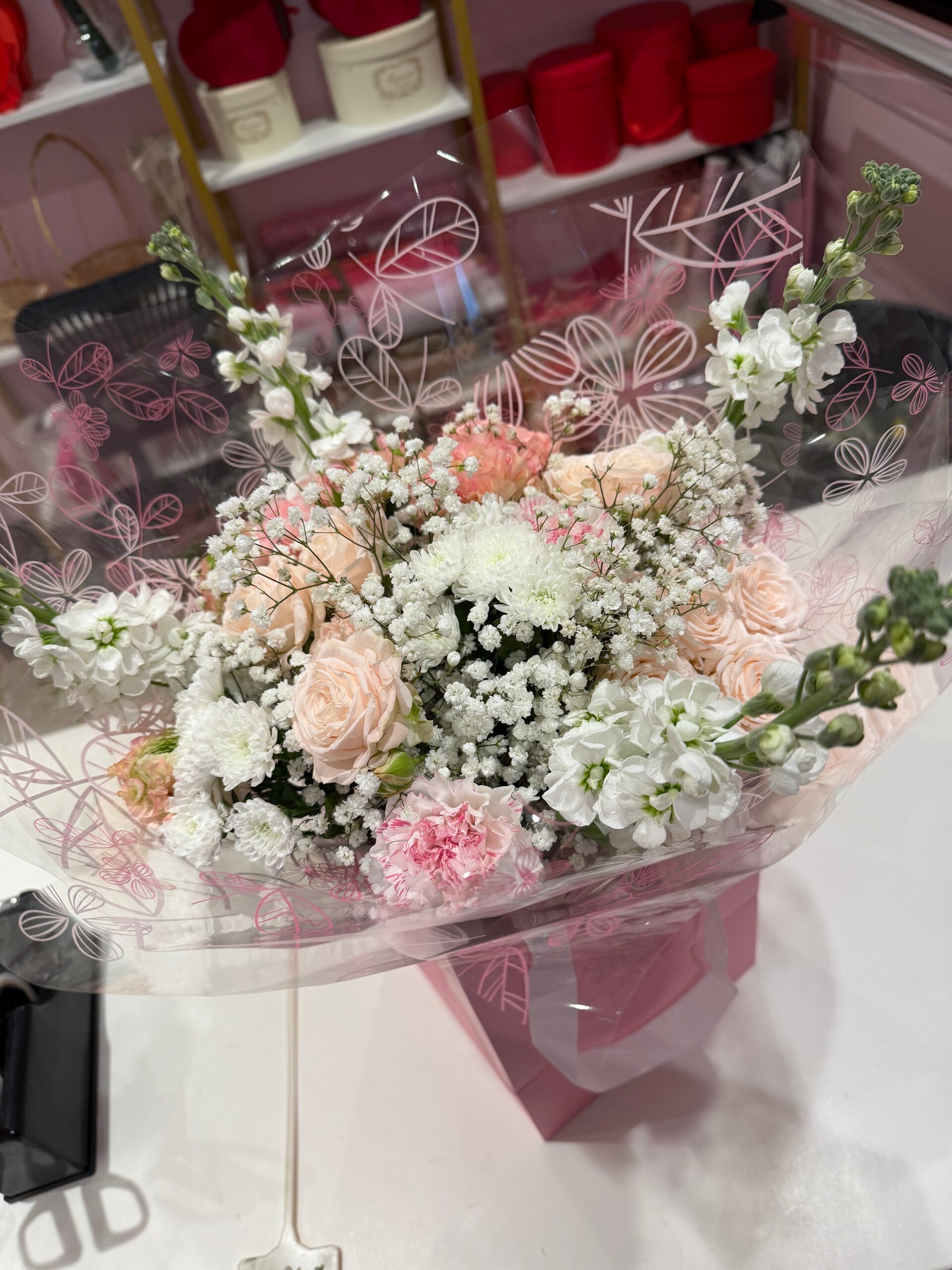 A soft and romantic floral arrangement presented in an elegant pink gift box. This bouquet features delicate blush Garden Roses paired with airy clusters of Baby's Breath that create a light, cloud-like texture. Fresh white Chrysanthem add fullness and balance, while graceful stems of Stock Flower bring height and fragrance to the arrangement. A soft pink Carnation accent adds a gentle touch of color and texture.