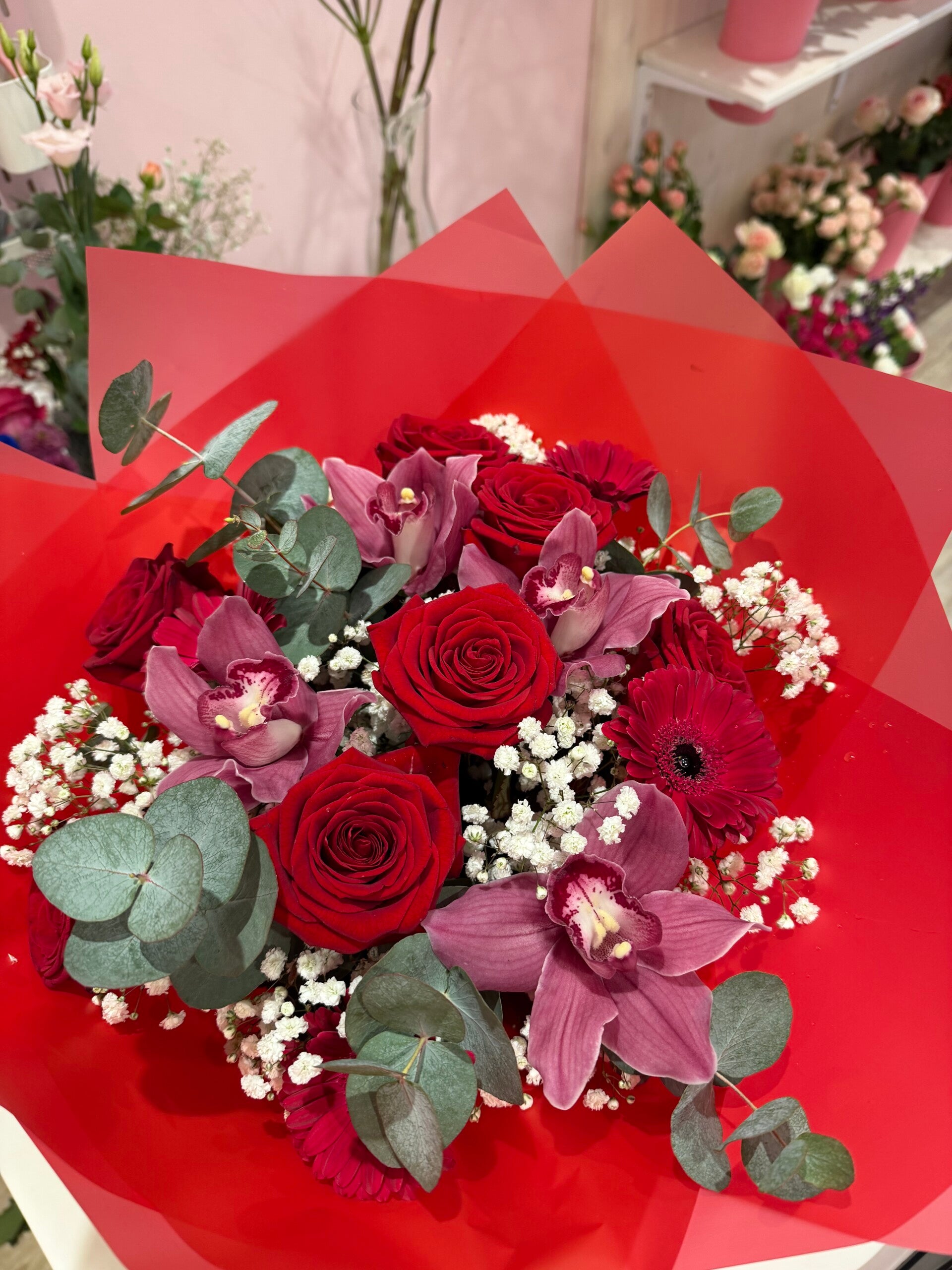 Bright red roses with cumbidium orchids and dark red gerberas. A bouquet for a special occasion. A soft touch of gypsophilia and eucaliptus. Comes with a red box and aqua pack.