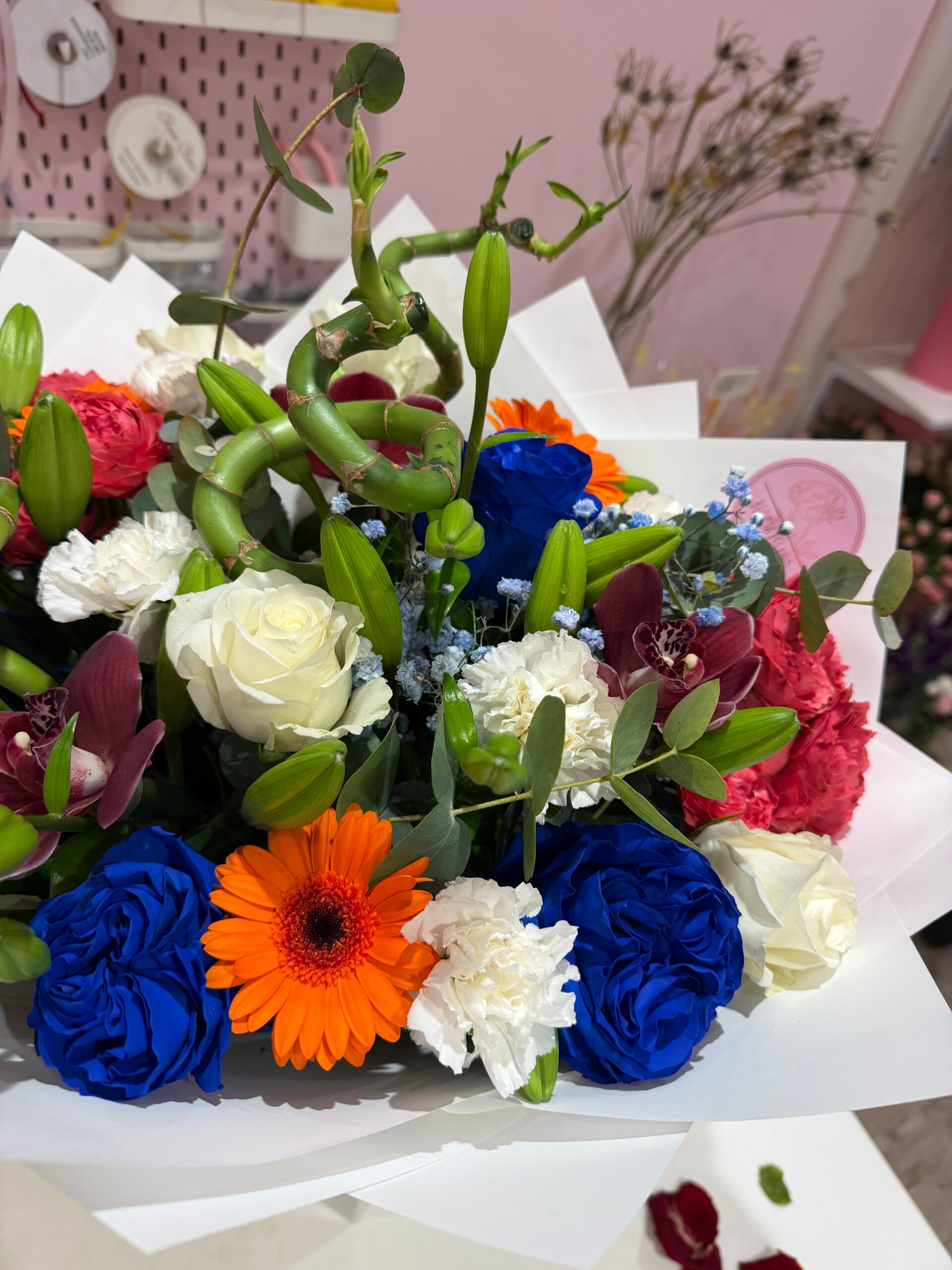 Custom arrangement with a mix of lucky bamboo, lilies, orchids, gerberas and blue roses with white roses. A mix for a special person who loves creative arrangements. Comes with a box and flower colour of your choice.