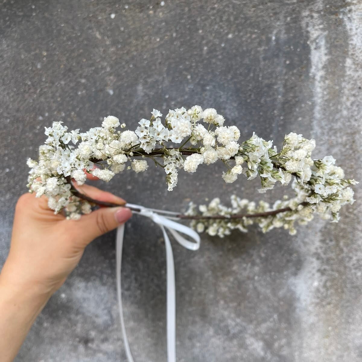 Wedding bridal crown with gypsophilia and white limonium finished with a white bow on the back.