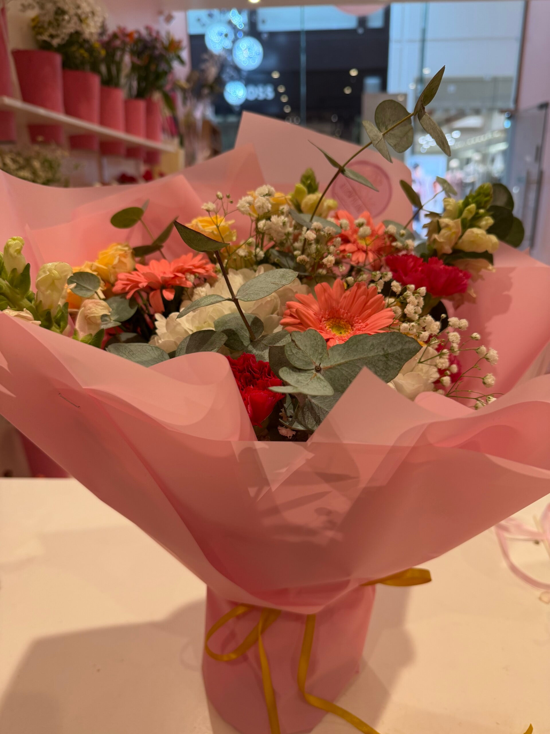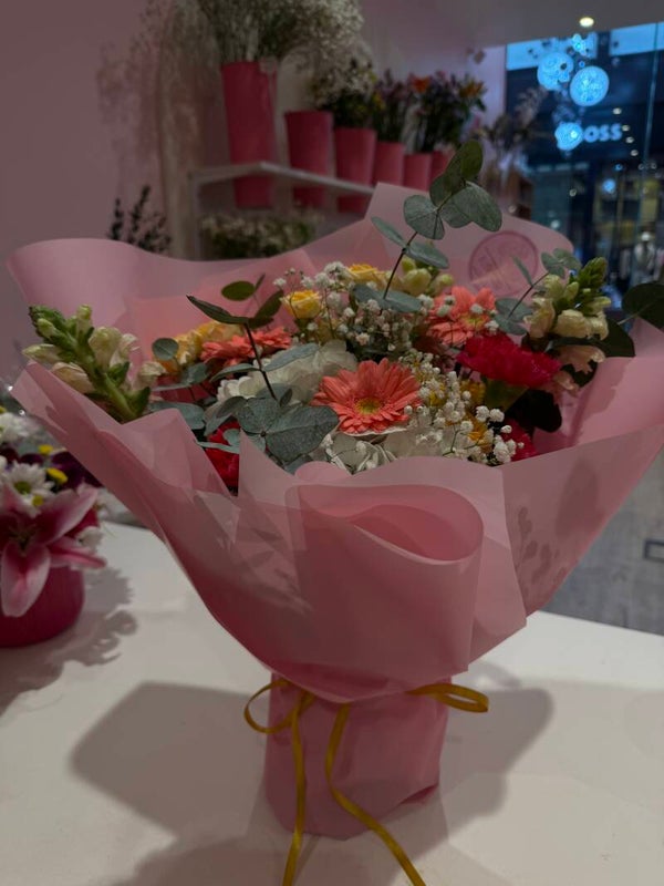 Custom bouquet in spring colour and soft touches of rusty. A messy arrangement with hydrangea, gerbera, snap dragon, eucaliptus and small spray roses. Wrapped in colour of customer's choice.