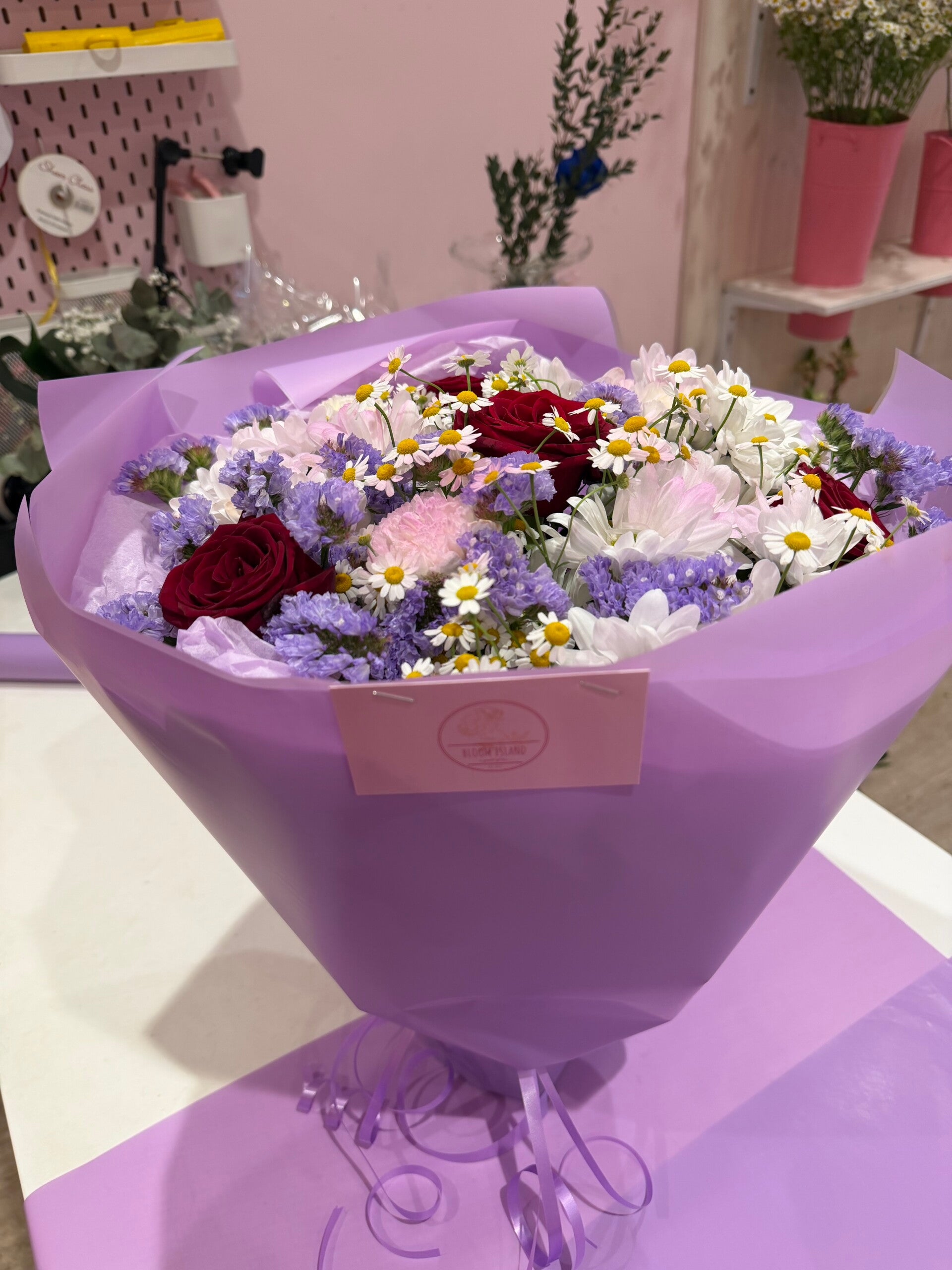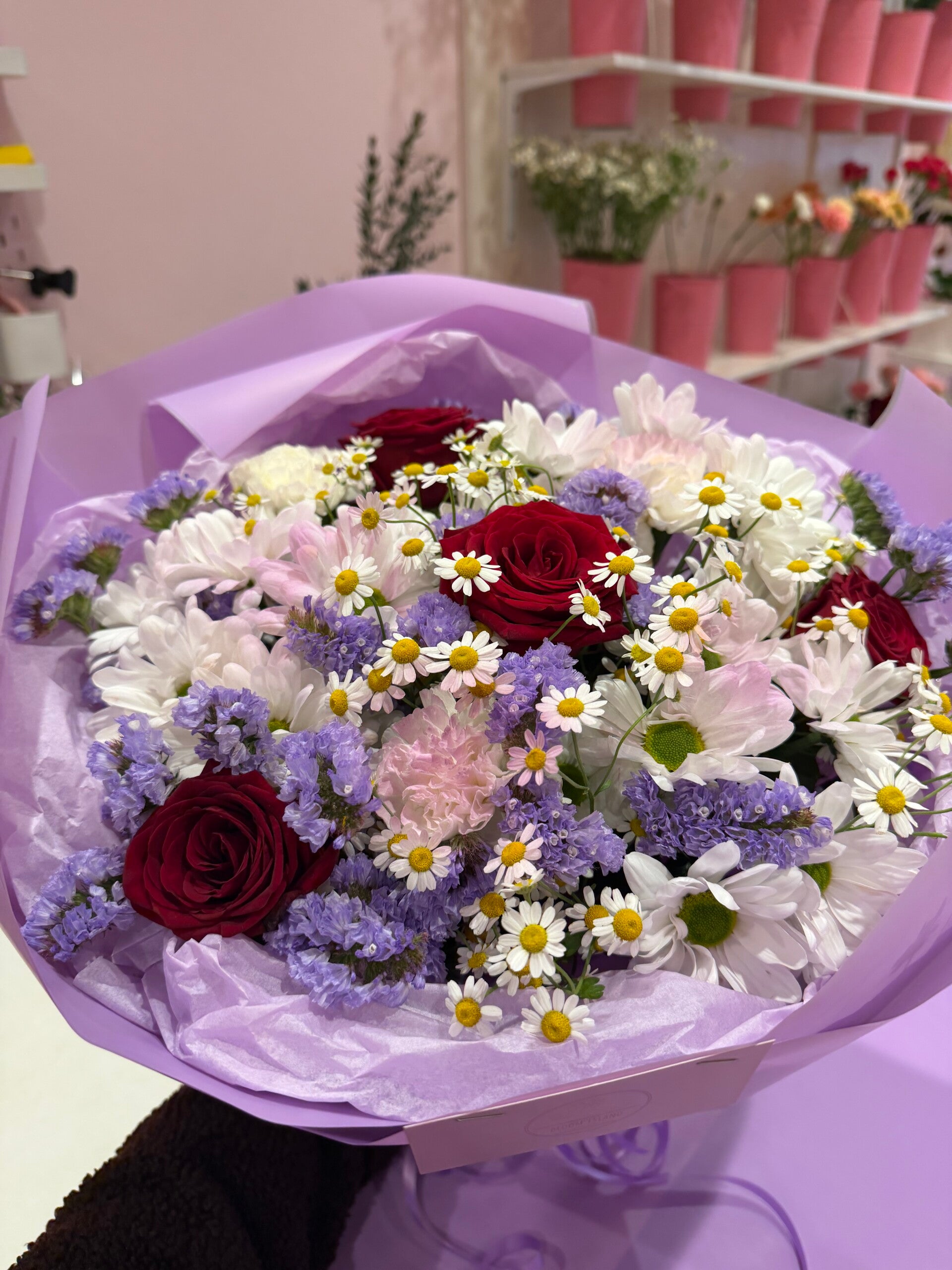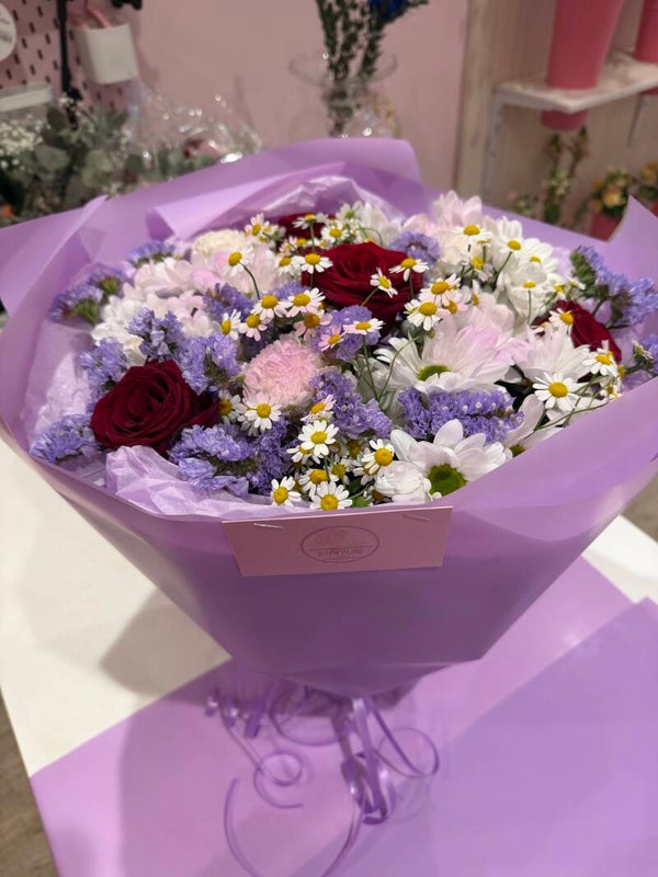 A bouquet with a touch of lilac colour, red roses and white chrisantems. Perfect for any occasions (any genders). Can be customised with other lilac flowers.