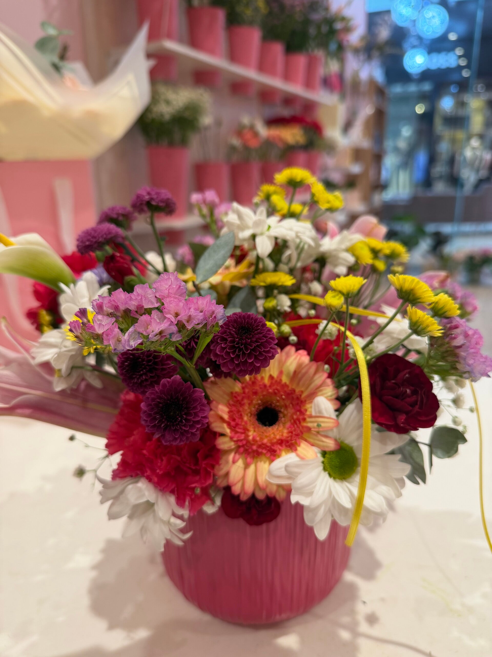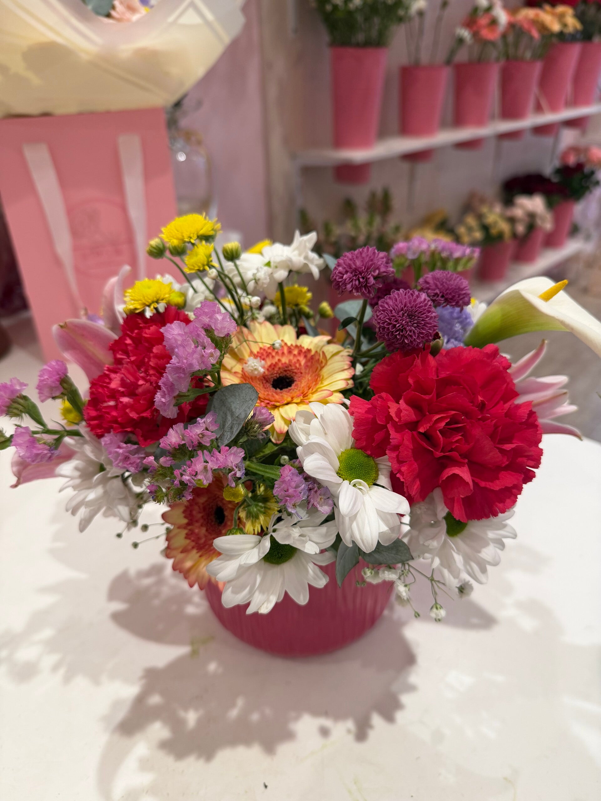 Customised arrangement with any flowers in a small pot. All arrangements are chosen by our florists. Reusable ceramic pots, or 20%off when you come next time to the shop to refreshen your pot with fresh flowers. All pots are different.